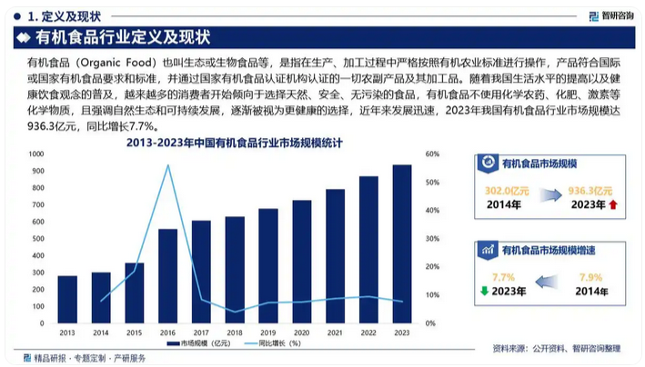 近年來,中國有機食品市場呈現(xiàn)快速增長趨勢。根據(jù)智研咨詢數(shù)據(jù)顯示,2023年中國有機食品市場規(guī)模達到936.3億元,同比增長7.7%。這一增長主要得益于消費者對健康、綠色食品的需求提升,以及政策對有機食品產(chǎn)業(yè)的支持。然而,有機食品市場競爭激烈,品牌需要在產(chǎn)品品質(zhì)、渠道布局和營銷策略上具備顯著優(yōu)勢,才能脫穎而出。